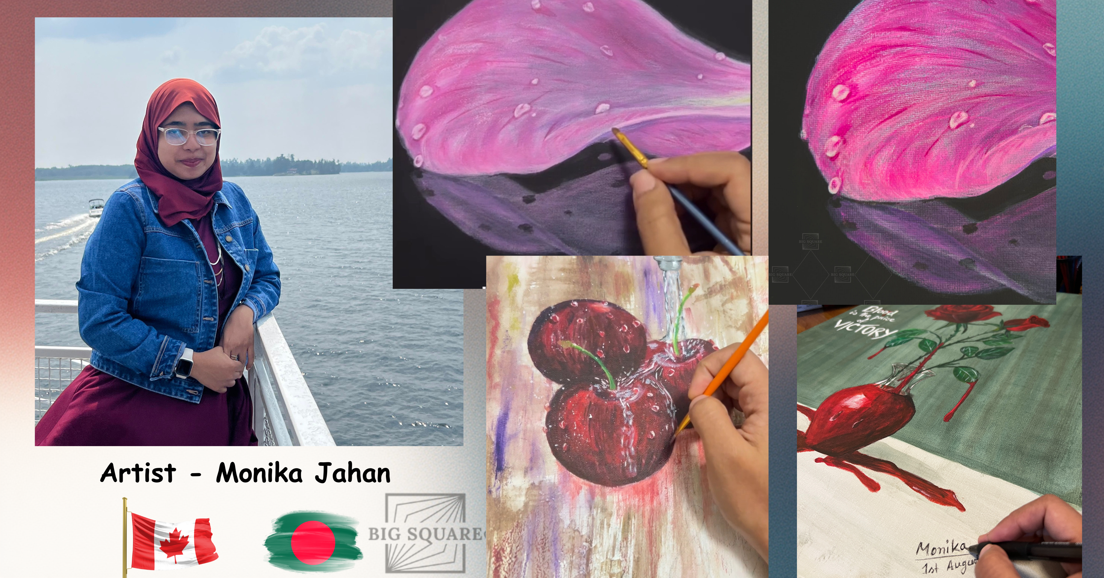 Artist Monika Jahan, currently living in Winnipeg, Canada, merges science and emotion in her art. She is an artist and a professional textile engineer with a lifelong passion for storytelling through the visual arts. Since 2010, she has been creating paintings that are rooted in meaning, emotion, and narrative — pieces that inspire viewers and leave a lasting message.